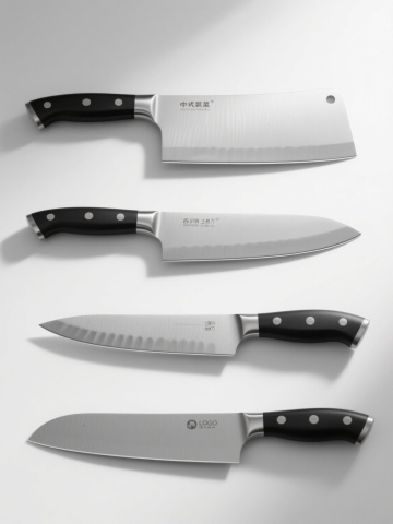 纯白纯色背景,超写实3D渲染风格,四把完全不同造型的刀呈规整矩形排布,每把刀保持金属刀身的拉丝质感与锋利刀刃细节,黑色刀柄设计各异(如光滑曲面、防滑纹路、木质拼接、镶嵌装饰),统一光源下的清晰投影与镜面反光效果,高清晰度产品展示级细节,专业厨具产品系列素材集合。