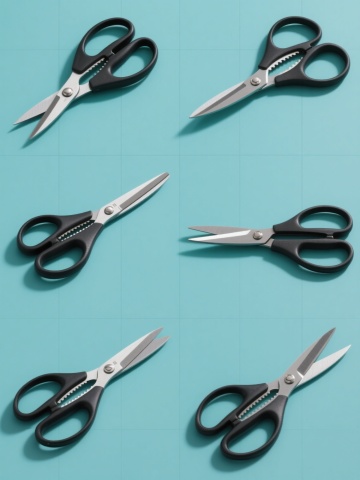 六把不同造型的剪刀系列素材集合,每把剪刀保持金属刀刃的光泽质感与黑色塑料手柄的材质对比,分别呈现完全不同的开启角度、手柄弧度和刀刃形状,以规整的网格排布于纯色背景上,整体采用统一的写实摄影风格,光线从左上方45度角照射形成自然阴影,色彩变换为清新的蓝绿色调,画面简洁无文字信息,突出剪刀的功能性设计美感与系列化视觉统一性。