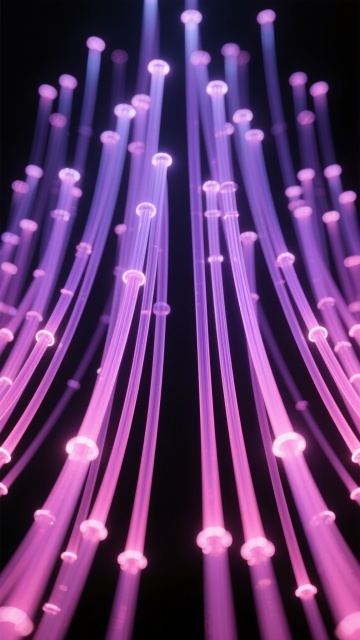 深蓝色渐变背景上,由无数垂直排列的细长光纤线条构成的抽象图案,光纤线条从深蓝到亮蓝渐变,部分线条带有明亮的高光,营造出科技感和未来感,线条疏密有致,整体呈现出流动而有序的视觉效果,现代简约风格,适合科技主题的背景设计。