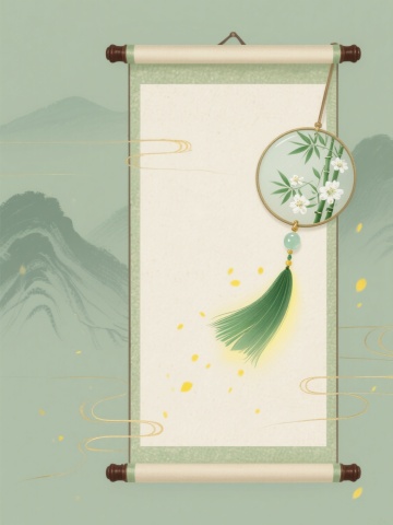 一张具有东方水墨风格的空白卷轴,卷轴主体为米白色宣纸,纸张边缘呈现自然的毛边效果,微微泛黄的纸面上有淡淡的墨痕纹理,营造出古朴典雅的氛围。卷轴上下两端为深棕色木质轴头,轴头雕刻有精致的祥云纹样,轴头两端镶嵌着金色的圆形装饰,整体构图简洁对称,留白充足,给人一种宁静致远的感觉,适合用作古典书画作品的载体。