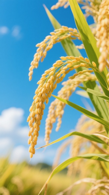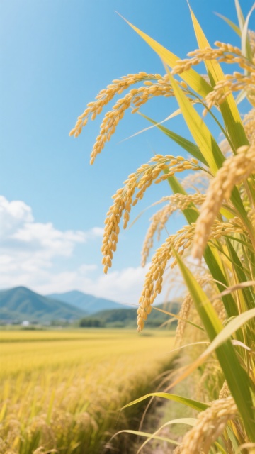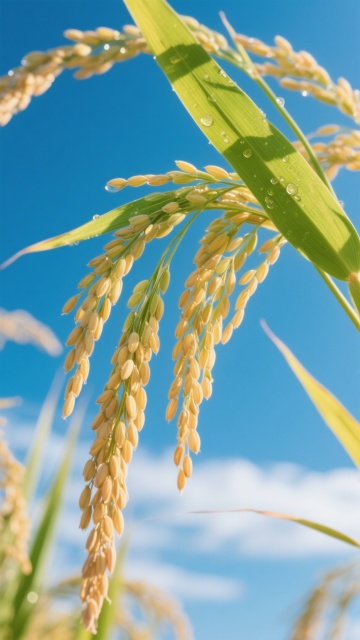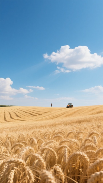 清新水彩风格的丰收主题海报,画面中广阔的金色麦穗田野占据下方60%空间,饱满的麦穗颗粒分明,麦芒清晰可见,随风微微摇曳,洋溢着丰收的喜悦氛围。天空占据上方40%作为留白区域,纯净的浅蓝色背景点缀着几缕柔和的白色云彩,营造出开阔透气的视觉效果。整体色调以温暖的金黄色和清新的蓝色为主,色彩过渡自然柔和,水彩特有的透明质感和细腻晕染效果贯穿画面,笔触轻盈灵动,画面简洁大方,能在短时间内传达出丰收的喜悦与自然的美好。
