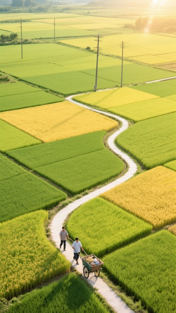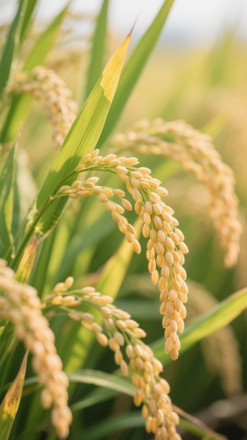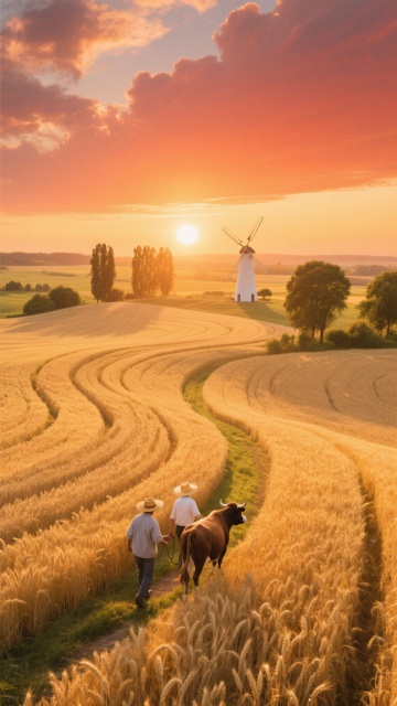 中国风插画风格,金色麦穗田野在夕阳下随风摇曳,饱满的麦穗颗粒分明,绿色麦秆挺拔有力,画面下方三分之二是一望无际的田野,上方三分之一是渐变的橙黄色天空与落日余晖,营造温暖喜悦的丰收氛围,留白占比35%,整体色调以金黄、橙红、翠绿为主,线条流畅,色彩明快,传递出对生活满足的幸福感。