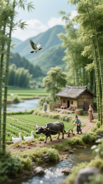 呈现出竹林场景的画面,充满自然与人文融合之美,营造出竹林氛围,飞鸟丶鹅及牛犁田点缀增添生机,展现生态的丰富与活力,传统木屋融入自然,体现当地建筑对环境的适应,身着汉族服饰的人物、传递出福建八山一水一分田地域文化与人和自然的和谐共处
