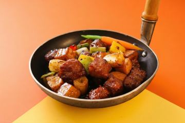 一张白色圆形瓷盘盛放的中式菜肴,菜品色泽红亮诱人,表面覆盖光泽感的酱汁,点缀细小的红色辣椒碎,食材形态自然堆叠,具有清晰的质感和细节,纯色白色背景,简约现代风格,整体构图规整居中,无任何文字、logo或水印