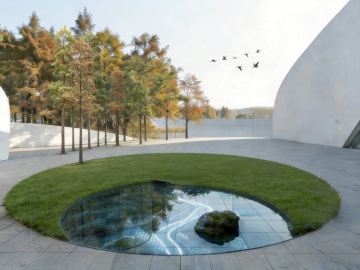 画面中央为圆形白色大理石展台,台面光滑有自然纹理,展台后方是新中式风格的浅米色磨砂质感墙面,墙面左侧有几缕柔和的斜射阳光形成光影层次。展台右侧摆放着一块形态自然的浅灰色岩石,岩石旁有一株枝干苍劲的青松,松针翠绿茂密,整体画面色调以米色、浅灰、墨绿为主,营造出宁静雅致的新中式氛围,光线柔和,阴影过渡自然,空间感通透,具有简约禅意的设计感。