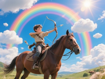 梦幻插画风,男孩骑马射箭,彩虹环绕,虚拟现实与超现实主义交融。