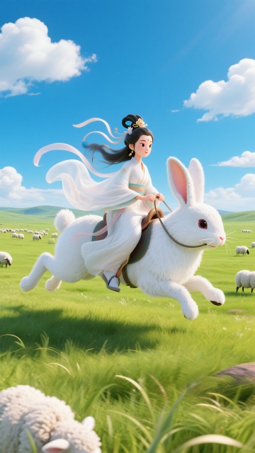 嫦娥穿着蒙古服饰在内蒙大草原骑着马奔跑