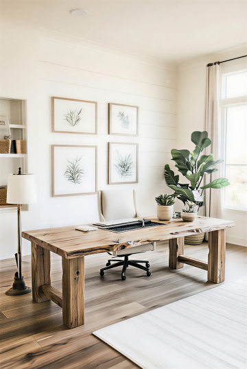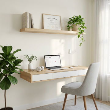 自然光从窗户斜射而入,在浅色墙壁上投下清晰的窗格阴影,营造出明亮通透、宁静舒适的居家办公氛围。一张原木色桌面的书桌,桌面光滑有自然木纹,桌腿为白色简约设计。桌上放置着不同场景和布置:左侧可能是一盆茂盛的绿色观叶植物,右侧是一台打开的银色笔记本电脑,电脑旁叠放着几本不同厚度的书籍,书籍上点缀着一盆小型多肉植物在白色花盆中;或者桌面上是一盏简约设计的台灯,旁边散落着几本翻开的笔记本和一支金属钢笔,桌角可能还有一个小巧的相框或一个复古风格的时钟;又或者是桌面上整齐排列着绘画工具,几支不同型号的画笔插在陶瓷笔筒中,旁边放着打开的颜料盒和一张铺展开的素描纸,角落点缀着一杯热气腾腾的咖啡杯。整体画面采用写实主义风格,色彩以原木色、白色、绿色为主,光影对比柔和,细节丰富,展现出现代简约而不失温馨的不同书桌场景布置。