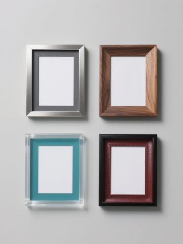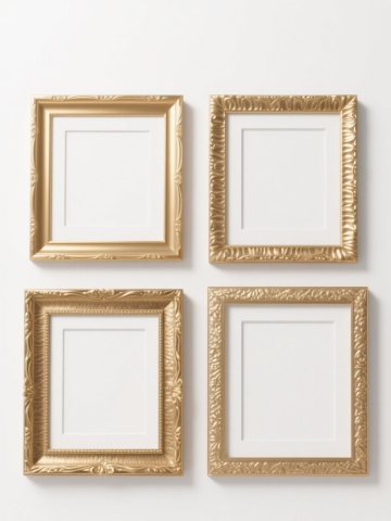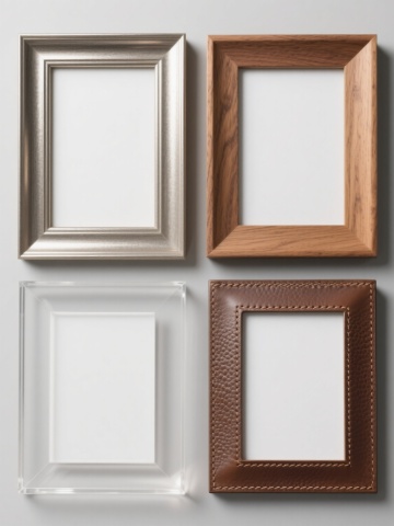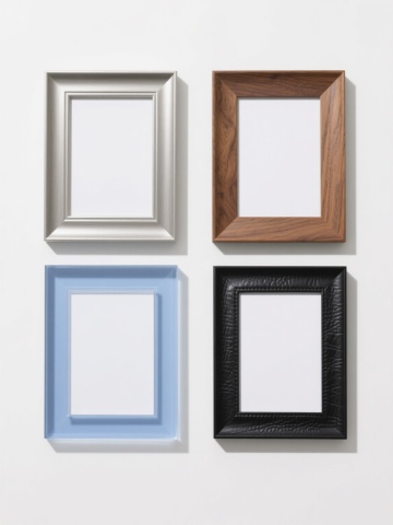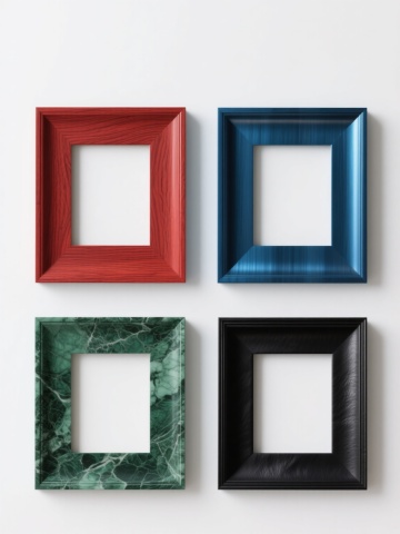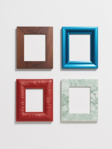 四个完全相同造型的深棕色木质相框,相框具有清晰的木纹质感和金色内边框装饰,每个相框内部为纯白色,四个相框以2x2的规整网格形式排布在纯白色纯色背景上,四个相框的整体色彩分别变换为:第一个相框为原木色木质配金色内框,第二个相框为黑色木质配银色内框,第三个相框为深蓝色木质配金色内框,第四个相框为红色木质配银色内框,保持所有相框的结构、木纹细节和尺寸比例完全一致,整体画面简洁干净,无任何文字、LOGO或其他装饰元素。