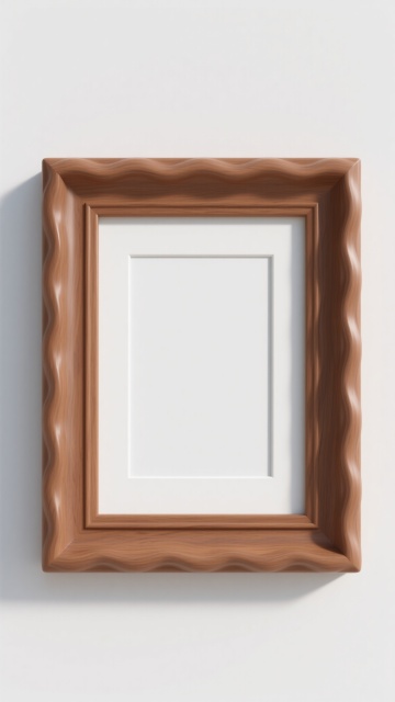一个具有3D渲染效果的棕色木质相框,相框边缘有立体的凸起装饰线条,内部镶嵌着白色的卡纸边框,卡纸中间区域为纯白色,整体相框放置在纯白色的背景上,光影效果呈现出轻微的高光和阴影,营造出简洁、干净的视觉氛围。