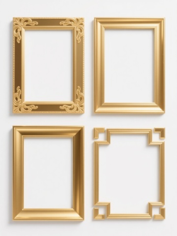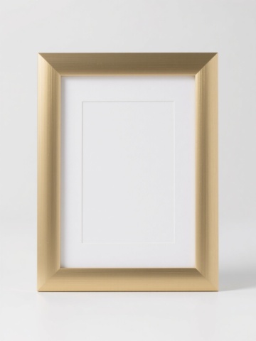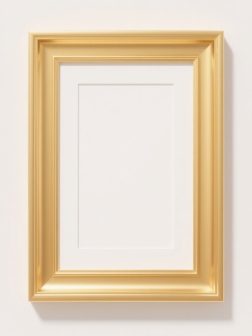 一个金色的画框,具有光滑的金属质感和明亮的高光,整体呈现出精致的3D渲染效果,纯金色调,边框样式为简约现代风格,线条流畅平直,无复杂雕花装饰,仅有细微的几何线条纹理,内部为纯白色矩形区域,整体构图居中对称,光影均匀柔和,具有清晰的边缘轮廓和立体感。