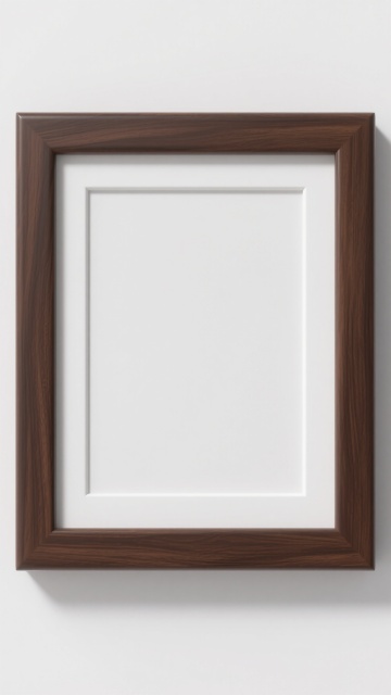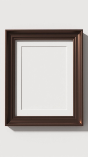 一个具有3D质感的相框,相框主体颜色为深棕色,表面带有细微的光泽和立体感,边框呈现出略微内凹的分层设计,内侧有一圈较窄的白色衬边。相框中间区域为纯白色,无任何图案或文字,整体背景为纯白色,光线均匀柔和,阴影细节自然,整体风格简洁、写实,具有清晰的数字艺术平滑过渡质感。
