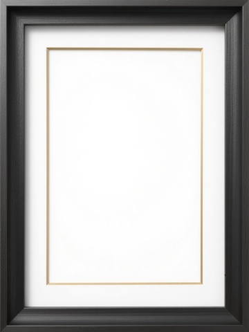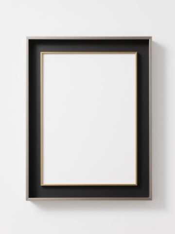 一个具有现代简约风格的画框,整体呈长方形,边框为双层结构,外层边框为哑光黑色金属材质,内层边框为金色金属细边,边框线条笔直、棱角分明,表面光滑无纹理,画框内部为纯白色空白区域,整体悬浮于纯白色背景之上,光线均匀柔和,无明显阴影,视觉层级清晰,信息传达简洁高效。