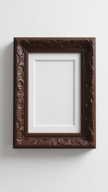 一个具有精致立体浮雕花纹的深棕色木质相框,相框内侧有一圈窄边的白色内衬,相框中间区域为纯白色,整体呈现出3D渲染的高清质感,光影过渡自然,立体感强,背景为纯白色,整个画面简洁干净,具有清晰的视觉层次和细腻的材质表现。
