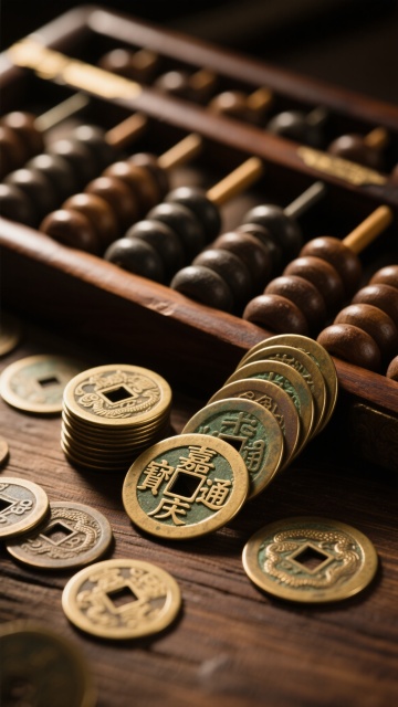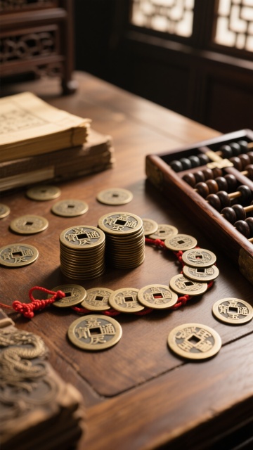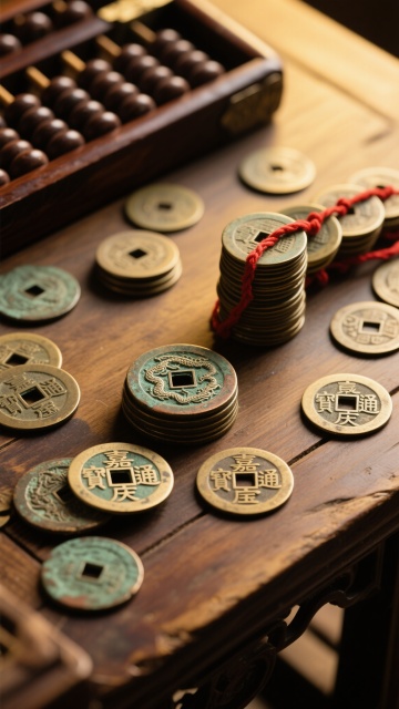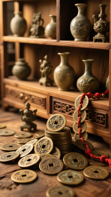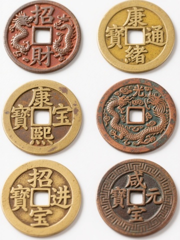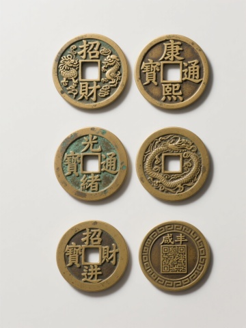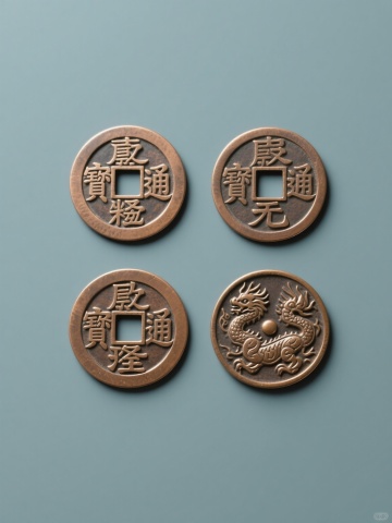 简约现代风格设计,纯色背景,四个规整排布的铜钱素材。铜钱呈现古铜色金属质感,表面有"招财进宝"等汉字及龙、虎、麒麟、凤凰等神兽浮雕图案,中央为方形孔洞,边缘有精细纹路,整体造型古朴与现代感结合,光影柔和,无任何文字、logo和水印。