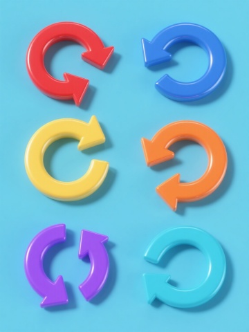 一系列六个完全不同造型的循环箭头元素集合,每个箭头元素均保持原图的3D立体渐变质感、光滑圆润边缘、白色描边轮廓和高光反光效果,采用纯色背景,画面整体色彩分别变换为蓝色、绿色、紫色、红色、黄色和青色,所有元素规整排布在同一画面中,呈现出清晰的视觉层级和高效的信息传达。