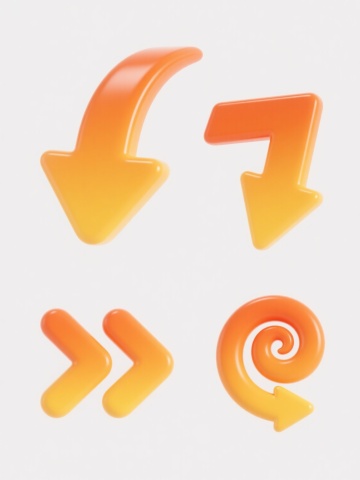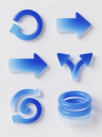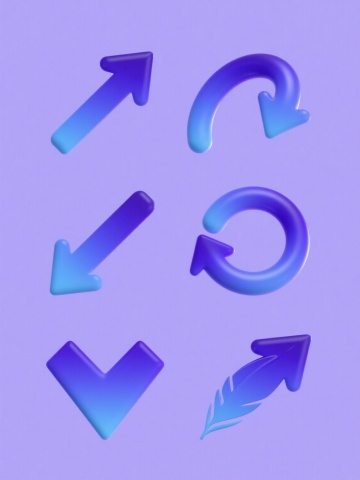 6个不同造型的抽象箭头符号组成的系列素材集合,每个箭头均保持光滑曲面3D立体风格、渐变色彩填充、高光与阴影立体效果,整体采用纯色背景,箭头造型分别为:向右上弯弧箭头、向左下斜直箭头、圆形回旋箭头、分叉双箭头、三角形箭头、带尾羽箭头,所有箭头规整对称排布,画面整体色彩变换为蓝紫渐变色调,保持现代简约设计感和视觉一致性。