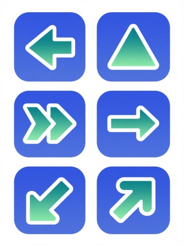 极简风格设计,六个完全不同造型的箭头图标系列素材集合,每个箭头保持简洁的几何形态、平滑无笔触的数字艺术质感和纯色渐变填充,整体色彩基于原图的蓝色渐变但每个箭头变换为不同的主色调(如红色、绿色、黄色、紫色、橙色、青色),所有箭头图标在白色纯色背景上以规整的网格状排布,确保视觉层级清晰、信息传达高效,保持统一的极简设计感和图形元素的纯粹性。