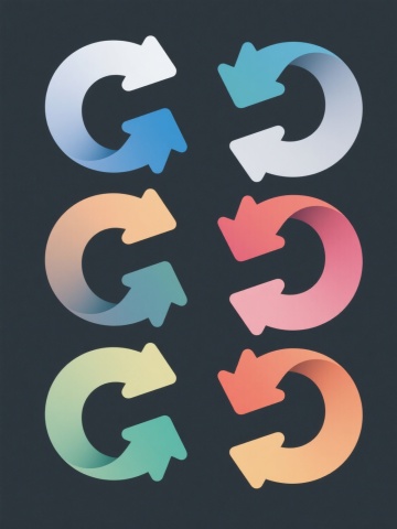 六个不同配色、不同样式、不同材质的「旋转箭头」素材,以左右两行对齐排列在浅色背景上,箭头设计包含环形循环箭头、多段式箭头、渐变箭头、虚线箭头等多种样式,材质呈现光滑金属质感、半透明渐变、磨砂质感等差异,配色丰富且对比鲜明,整体构图简洁整齐,视觉层次清晰,符合现代UI设计风格,适合作为功能图标或指示元素使用。
