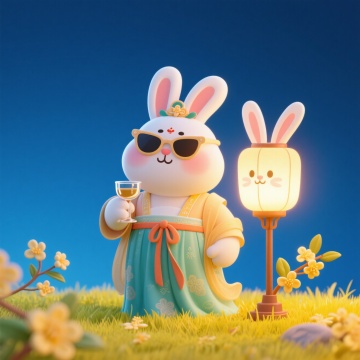 3D卡通风格,拟人化兔子身着中式服饰,手持酒杯,旁有兔形灯笼,营造中秋佳节温馨氛围。