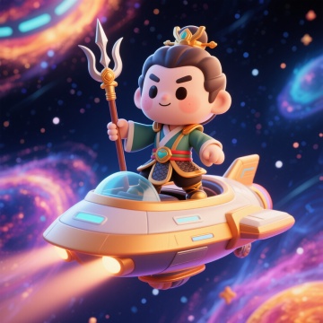 软3D风卡通角色,手持三叉戟,驾驶飞船穿梭宇宙,未来感与虚拟现实完美融合。