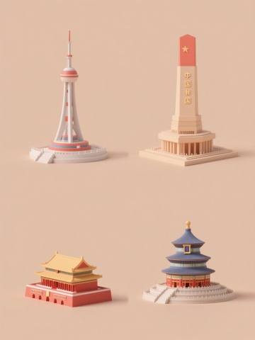 一套4个规整排布的3D风格国家地标素材,每个地标均采用类似故宫的低多边形3D建模风格,具有平滑的表面和清晰的边缘轮廓,主色调为红色、黄色和绿色等传统色彩,整体呈现出简洁而富有立体感的视觉效果,每个地标元素独立排列,背景为纯色无任何纹理,无文字、无logo、无水印,整体设计具有强烈的视觉层级和信息传达效率。