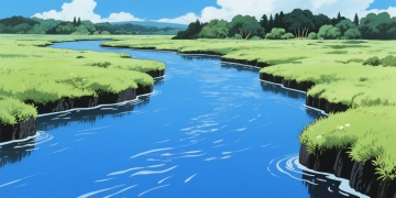 清新水彩风动漫,碧蓝河流穿绿野,自然和谐,夏日宁静。
