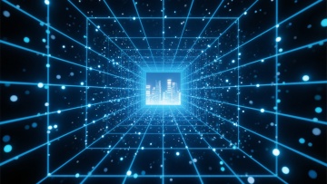 粒子城市建筑,数码粒子,空间感强,科技风,蓝色粒子像河流一样流淌过画面,橙色粒子夹杂在其中,画面高级