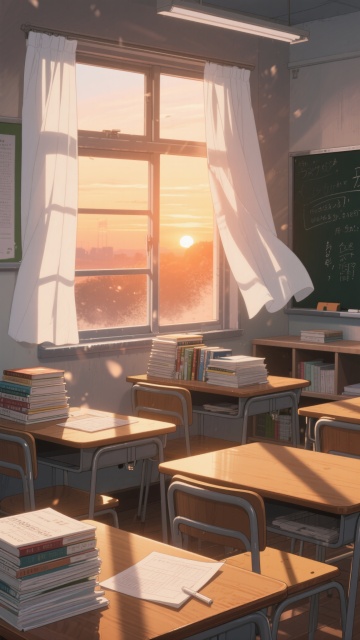 广角镜头,清晨阳光透过布满露珠的老式铁框玻璃窗,在百年老校的木质地板上投射出菱形光斑,教室前方的墨绿色黑板上用白色粉笔写着未完成的数学公式和莎士比亚诗句,旁边贴着泛黄的世界地图和学生们的水彩画。三十张樱桃木课桌整齐排列,每张桌面都留有不同年代学生的刻痕和涂鸦,上面散落着翻开的牛皮纸笔记本、金属铅笔盒和半融化的蜡笔。教室后方的橡木书柜里塞满了包着棕色牛皮纸的旧书,最高层摆放着一个1950年代的地球仪和铜制显微镜。阳光中漂浮着细微的尘埃,空气中混合着粉笔灰和旧纸张的干燥气息,靠近窗户的课桌上放着一盆快要开花的仙人掌,整个空间被柔和的琥珀色晨光笼罩,时间仿佛凝固在某个被遗忘的早读时刻。