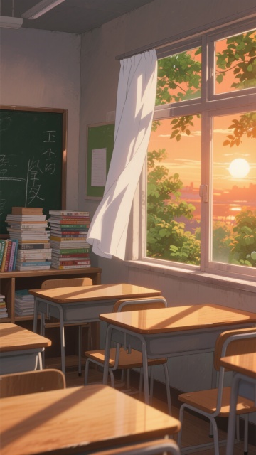 尺寸为1080X1920,,画面整体为鲜艳明亮的暖色调,背景为的教室内景(三分之二可见黑板,三分之一为窗户,窗外是阳光明媚的校园风景,不要出现天花板),前景是课桌(桌面纹理清晰,无遮挡),聚焦在前景课桌上,画面重心居下