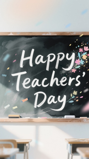 水彩风插画,教室里阳光洒落,花束与书本营造梦幻清新文艺感,黑板上“教师节快乐”字样温馨。