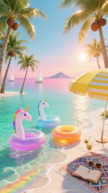 广角俯视角,清晨的热带海湾正苏醒在蜂蜜色的阳光中,3D渲染风格。绿松石色的海水如液态水晶般漫过渐变的白色沙滩,三只半透明的充气独角兽泳圈——粉紫渐变、蓝白渐变和橙黄渐变——正随潮水轻轻碰撞,在水面编织出彩虹般的波纹图案。右侧椰林边缘立着一顶亮黄色的条纹遮阳伞,伞下铺着波西米亚风格的几何图案沙滩巾,上面随意摆放着一本翻开的航海日志、半杯冰椰汁和一副玳瑁色太阳镜。六棵高大的椰子树以黄金分割排列,叶片在晨光中呈现出半透明的翡翠质感,树干上还挂着几个成熟的棕褐色椰子。远处海平面与渐变的蜜桃粉到天蓝色的天空相接,几艘白色帆船正扬起三角帆,海天交界处隐约可见火山岛的轮廓。阳光从画面右上角斜射而下,在海面切割出一条闪烁的金色光带,伞沿和椰子叶边缘都镶着耀眼的金边,整个场景散发着慵懒奢华的夏日度假气息,高饱和度色彩与柔和的体积光交织出梦幻般的视觉盛宴。