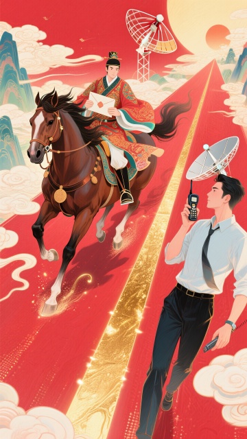 现代人用手机通讯与传统快马传信形成对比,黄色色主色调,红色点缀,鎏金道路带光效,对角线构图,画面明亮