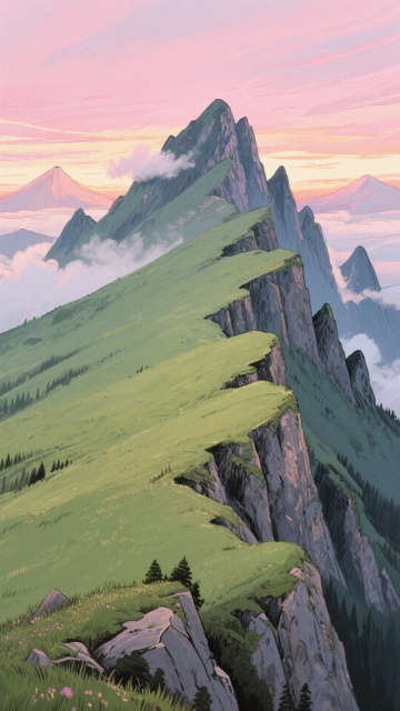 从半山腰往山顶仰视。广阔的高山草甸前方,从左到右并排着连绵的山峰,它们看起来有的崎岖,有的平坦。晚霞的天空泛着粉色的光,而接近山顶的地方云烟缭绕。