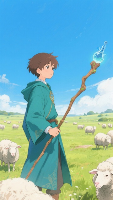 日式动漫风格田园插画,一位褐色短发,眼神坚毅,面部清晰,侧着身子,穿着蓝绿色炼金术士服装的牧羊少年,拿着类似魔法师木法杖,正在牧羊。背景为大片清澈的天空,下面有一片草原,有好多绵羊