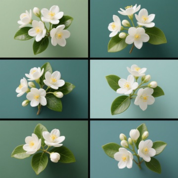 6个不同造型的同系列茉莉花素材集合,每个素材均为高写实风格的茉莉花束,包含开放的白色花朵、黄色花蕊、绿色带叶脉叶片及花苞,保持相同的细腻质感与光影表现,花朵与叶片的组合形态各异,分别置于6种不同颜色的纯色背景上,整体呈规整的网格状排布。