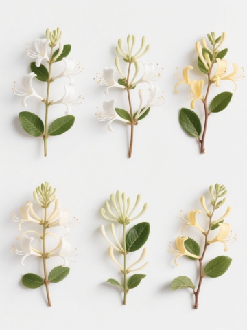 一组由六个完全不同造型的金银花组成的系列素材集合,每个金银花造型独特,包含白色和淡黄色的花朵、绿色的叶子及枝干,保持超写实的摄影风格,清晰的细节纹理,自然的光影效果,纯白纯色背景,所有元素规整地排布在画面中,形成协调统一的系列感。