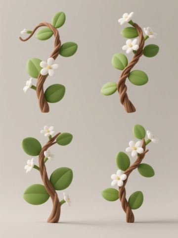 四个不同藤蔓素材规整排布,每个藤蔓都有自然弯曲的棕色枝干,点缀着饱满的绿色叶片和白色花朵,保持高写实的3D质感,藤蔓形态各异,有的花朵含苞待放,有的完全盛开,叶片大小和形状略有不同,整体呈现出自然生长的灵动姿态,背景为纯白色纯色背景,无任何文字、logo和水印,画面简洁干净,突出藤蔓的细节和质感。