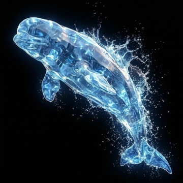 透明玻璃质感的白鲸跃出水面,液态光影交织,3D立体呈现未来科技与虚拟自然的梦幻融合,清透感十足。