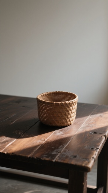 一张具有电影感光影效果的静物摄影,深棕色木纹桌面占据画面主要部分,桌面纹理清晰可见,边缘略带粗犷感。桌面上放置着一个圆形的编织藤篮,篮子颜色为浅棕色,编织纹理细腻。背景变换为柔和的浅灰色墙面,墙面质感平滑,与深色桌面形成对比。整体色调温暖,光线从画面左侧斜射进来,在桌面上形成柔和的光影过渡,营造出宁静而温馨的氛围,具有高清晰度和细腻的材质表现。