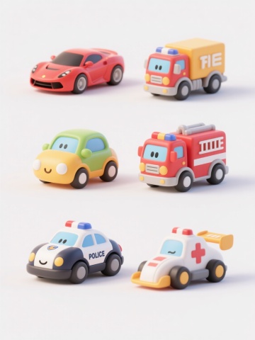 3D卡通风格,六个不同配色、不同材质、不同样式的交通工具元素,排列整齐,白色背景,圆润可爱的造型,鲜艳明亮的色彩,光滑的塑料质感,部分带有透明光泽,每个交通工具都有独特的设计细节,整体呈现出活泼欢快的氛围,具有儿童玩具般的萌系感,光影柔和,边缘清晰,无阴影,简洁干净的视觉效果。