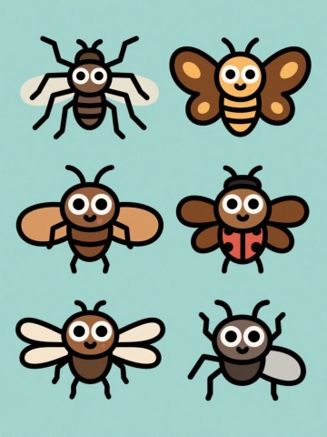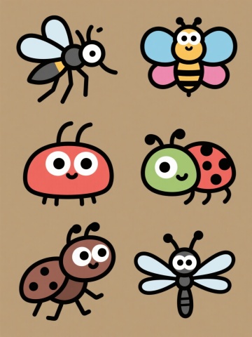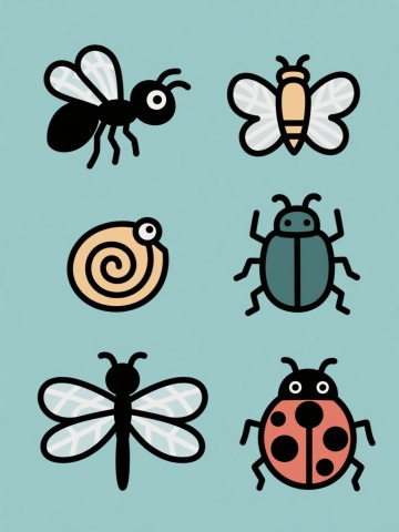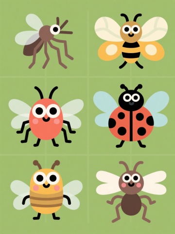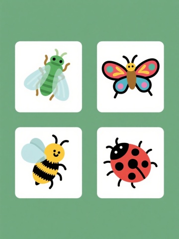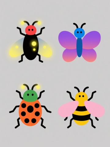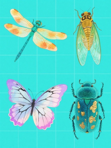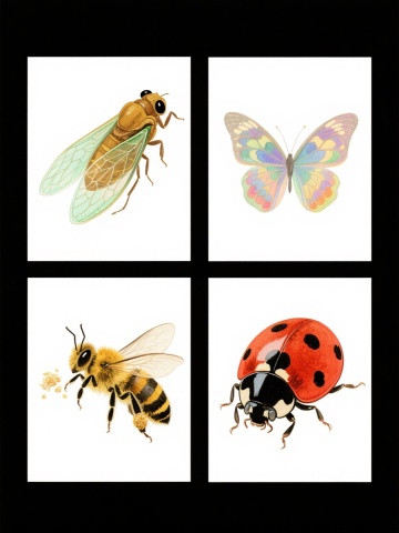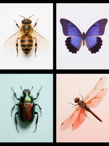 系列插画,包含四个不同的昆虫元素:一只蓝色渐变身体配透明翅膀的蝴蝶、一只绿色甲壳带金属光泽的甲虫、一只紫色条纹腹部的蜜蜂、一只橙红色带黑色斑点的瓢虫,均采用3D立体风格,表面有细腻的绒毛质感和光泽反射,翅膀透明并带有清晰纹理,每个昆虫姿态自然生动,悬浮于各自独立的纯色背景上(分别为浅蓝、嫩绿、淡紫、暖橙),整体色彩明快鲜艳,四个元素规整排布在同一画面中,形成协调统一的系列感,无文字、LOGO及二维码。
