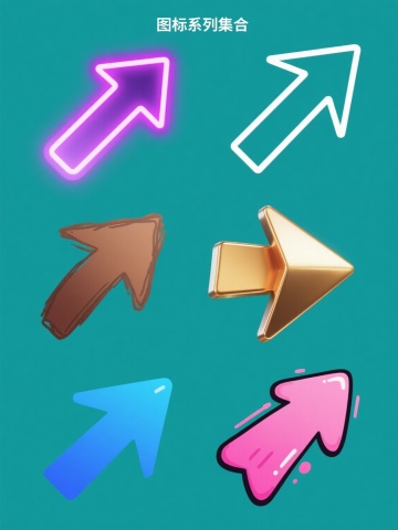 六个不同风格、不同造型的箭头图标系列素材集合,每个箭头均为纯色背景,包含赛博朋克霓虹风格紫色箭头、极简线条白色箭头、复古手绘风格棕色箭头、渐变金属质感金色箭头、扁平化设计蓝色箭头、卡通涂鸦风格粉色箭头,所有箭头规整排布在同一画面中,保持箭头元素内容,整体色彩丰富多样