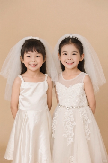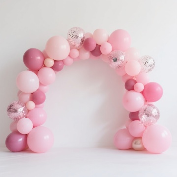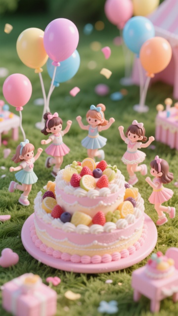 明亮温馨的生日派对场景背景,纯净的白色护墙板墙面,上方悬挂着粉色、白色和金色的纸扇花装饰,地面散落着粉色、白色和金色的气球,中央摆放铺着粉色桌布的餐桌,周围有穿着浅色公主裙戴着生日帽的小女孩们,整体呈现出甜美、欢快、充满童趣的氛围,光线明亮柔和,色彩以粉色、白色和金色为主色调,构图饱满且富有层次感,具有清晰的视觉引导和温馨的家庭聚会感觉。