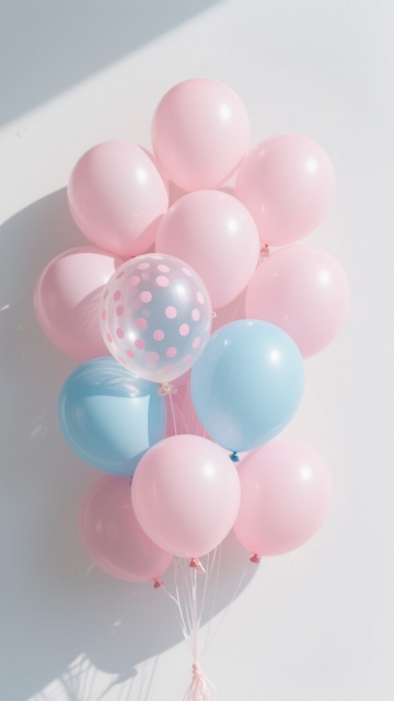 4. 透明玻璃质感:渐变蓝背景上的半透明玻璃气球组合,柠檬黄五角星气球带有磨砂圆点,薰衣草紫圆形气球,冰蓝白条纹圆形气球,蜜桃粉心形气球带有水晶星星图案,所有气球通过透明亚克力链条连接,表面呈现玻璃特有的折射光斑和气泡细节,清透色调营造出梦幻空灵的氛围