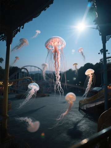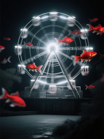 夜晚的游乐园场景,深蓝色的夜空中点缀着璀璨的星星和一轮弯月,过山车轨道在霓虹灯的照射下呈现出鲜艳的红、黄、蓝、紫等色彩,像一条发光的巨龙蜿蜒盘旋,旋转木马的顶部装饰着华丽的水晶灯,木马身上有着精致的彩绘图案,闪烁着柔和的光芒,摩天轮巨大的轮盘上布满了五颜六色的LED灯,不断变换着绚丽的图案,游乐园里的小摊贩亮着各式各样的彩灯招牌,售卖着棉花糖、爆米花等零食,地面上有着彩色的灯带勾勒出道路的轮廓,整个场景充满了梦幻、欢乐、热闹的氛围,光影效果丰富,色彩鲜艳明快,具有强烈的视觉冲击力和节日的喜庆感。