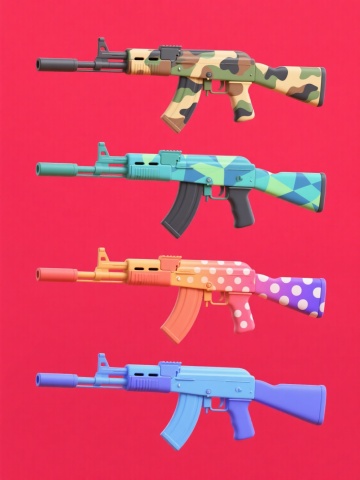 6个不同样式、不同配色、不同风格的水枪,3D立体建模,圆润光滑的塑料质感,鲜艳明快的马卡龙色系与高饱和撞色搭配,每个水枪具有独特的造型设计(如单管、双管、长喷嘴、短握把等),统一的卡通风格,柔和的顶部光源,清晰的高光与阴影过渡,纯色背景,整齐排列成一行,间距均匀,画面简洁干净,充满童趣与夏日气息。