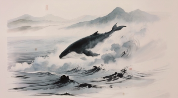 透明玻璃质感的白鲸跃出水面,液态光影交织,3D立体呈现未来科技与虚拟自然的梦幻融合,清透感十足。
