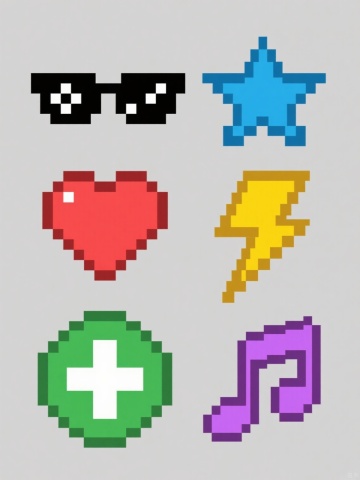 8-bit像素艺术风格,纯色背景,6个不同元素的系列素材集合规整排布,每个元素保持相同尺寸和像素块构成方式,元素包括:黑色太阳镜(镜片有白色斜向方块图案)、红色爱心(中心白色小圆点)、蓝色五角星(五个角尖锐)、黄色闪电符号(锯齿状边缘)、绿色圆形(内部白色十字)、紫色音乐音符(八分音符带尾巴),所有元素轮廓清晰,像素边缘锐利,色彩鲜明且各自具有独特的主色调,整体布局整齐对称,风格统一为复古电子游戏像素风。