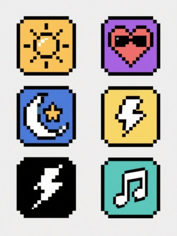 一系列6个不同的8位像素艺术图标,保持相同的16x16像素网格大小和简约风格,每个图标都有纯色背景,色彩各异,元素类别包括太阳镜、心形、星星、月亮、闪电和音乐符号,规整地排列成一行或两行,每个图标都有清晰的黑色轮廓和内部的白色像素细节,整体呈现出复古电子游戏的视觉美感。